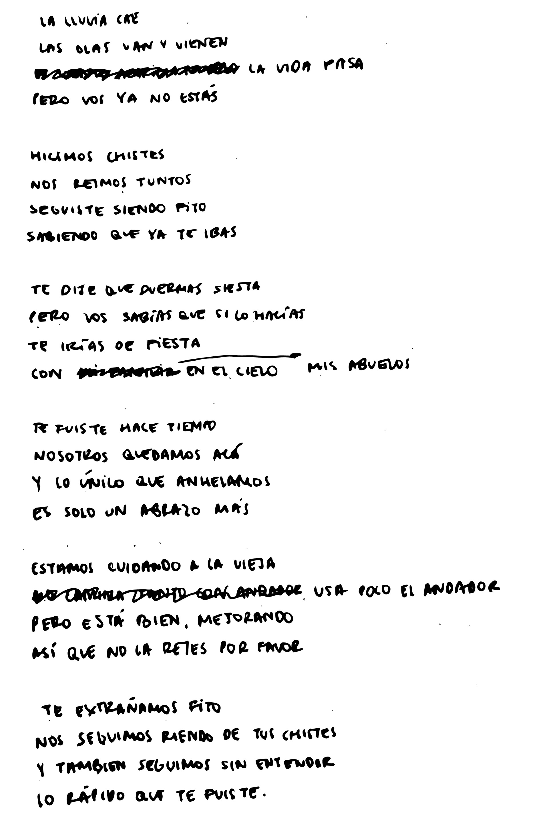 Es raro saber que alguien que un día podías ver y llamar, hacerle chistes, darle un abrazo, ya no está más. Saber que Fito que estaba siempre esperando a que lo visitáramos con una sonrisa y un chiste en el bolsillo, ya no está esperándome. No sé cómo explicarlo porque es algo que en una situación normal comprendo pero cuando me acuerdo que realmente no está y que no es solo una idea sino un hecho, se me borra toda noción y comprensión.